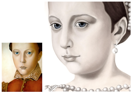 De schilderkunstige techniek is teruggebracht tot een ambachtelijk niveau. Het portret van de oude meester is vakkundig gestript tot op de naakte huid van het geportretteerde kind. Geen intens gekras, geen zwierige penseelstreek. Het beeld is geneutraliseerd, gemaniëreerd. Het individuele kind is gereduceerd tot een uniform icoon. De versierselen, behorende bij de status van koningskind zijn gebleven maar van hun glans beroofd. Wat rest is het stoffelijke omhulsel.